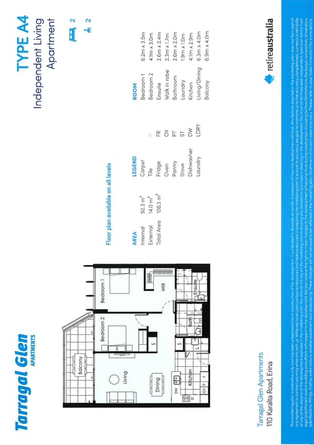 Located on Level 1, Apartment 7108 presents a generous floor plan enhanced by an east-facing aspect and beautiful natural light. Explore the open-plan living and dining zone which extends seamlessly to a private balcony, creating an inviting setting for morning coffee or relaxed entertaining. The stylish kitchen includes quality appliances, ample cabinetry and elegant finishes designed for practical, low-maintenance living. The master suite offers a walk-in robe and private ensuite, complemented by a second bedroom and full bathroom for visiting family or additional living space. Features include:  * Level 1 convenience  * East-facing balcony  * Expansive floorplan  * Two bathrooms including master ensuite  * Modern kitchen with quality appliances  * Ducted air conditioning  * 24/7 emergency help system  * Liveable Housing design for ageing in place  * Access to extensive resident amenities  * Pet friendly environment  A refined apartment offering privacy, comfort and connection.  What better way to open your next chapter than settling into a brand new apartment at Tarragal Glen? Designed for living and ageing well, the new apartments offer all you need for a lifestyle of independence and connection, with a safety net of a caring village team and friendly neighbours.