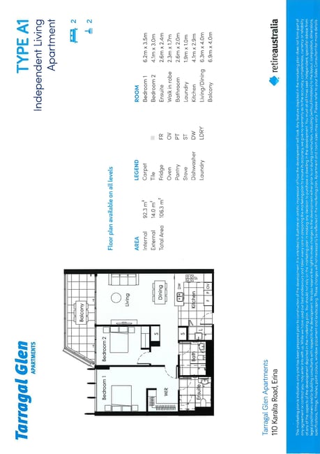 Positioned on Level 1, step into Apartment 7105 which enjoys beautiful morning light and a thoughtfully designed floorplan that balances comfort with easy living. Explore the open-plan kitchen, living and dining area which flows seamlessly to a private east-facing balcony, creating a warm and welcoming space to start your day. The contemporary kitchen features quality appliances, generous storage and refined finishes, ideal for both everyday living and entertaining. The master bedroom includes a walk-in robe and private ensuite, while the second bedroom and bathroom provide flexibility for guests, hobbies or a study. Features include:  * Level 1 position with easy access  * East-facing balcony capturing morning sun  * Two spacious bedrooms, master with walk-in robe and ensuite  * Contemporary kitchen with quality appliances  * Open-plan living and dining  * Ducted reverse-cycle air conditioning  * 24/7 emergency call system  * Gold Star Liveable Housing design principles  * Access to premium amenities including indoor heated pool, gym, bowling green, cinema, hair salon and community spaces  * Pet friendly village Enjoy independent living within a vibrant and established Tarragal Glen community. What better way to open your next chapter than settling into a brand new apartment at Tarragal Glen? Designed for living and ageing well, the new apartments offer all you need for a lifestyle of independence and connection.