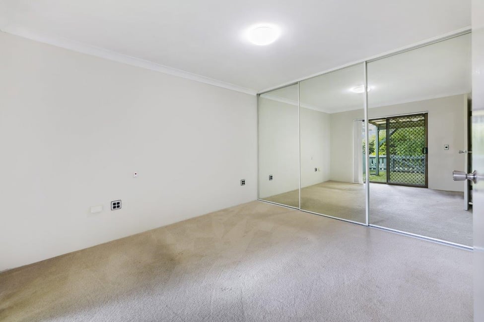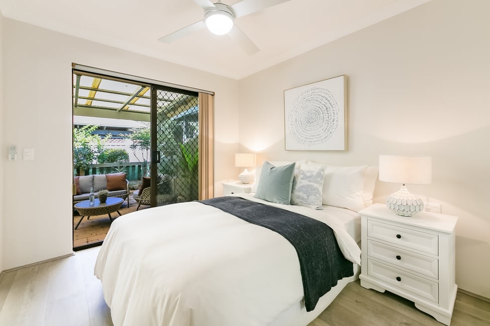 • Bedroom with mirrored, custom built ins ceiling fan light & sliding security door access to courtyard