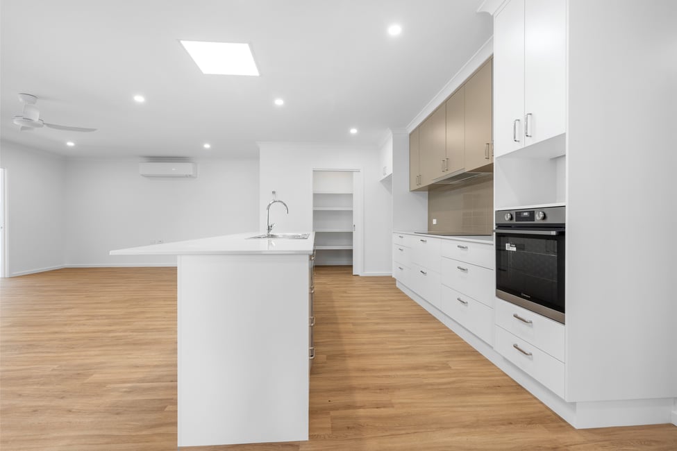 Gourmet galley style electric kitchen with dishwasher and walk in pantry