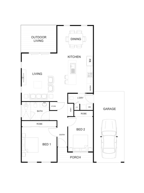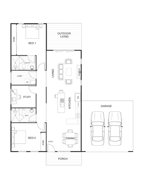 Two well-designed bedrooms offer comfortable retreats, complemented by a practical study for work or hobbies. A separate laundry and thoughtfully planned layout keep daily routines simple, while the single carport with a motor lift door adds extra convenience. With its blend of sleek design and practical functionality, The Hawkins is a place where modern living feels effortless.