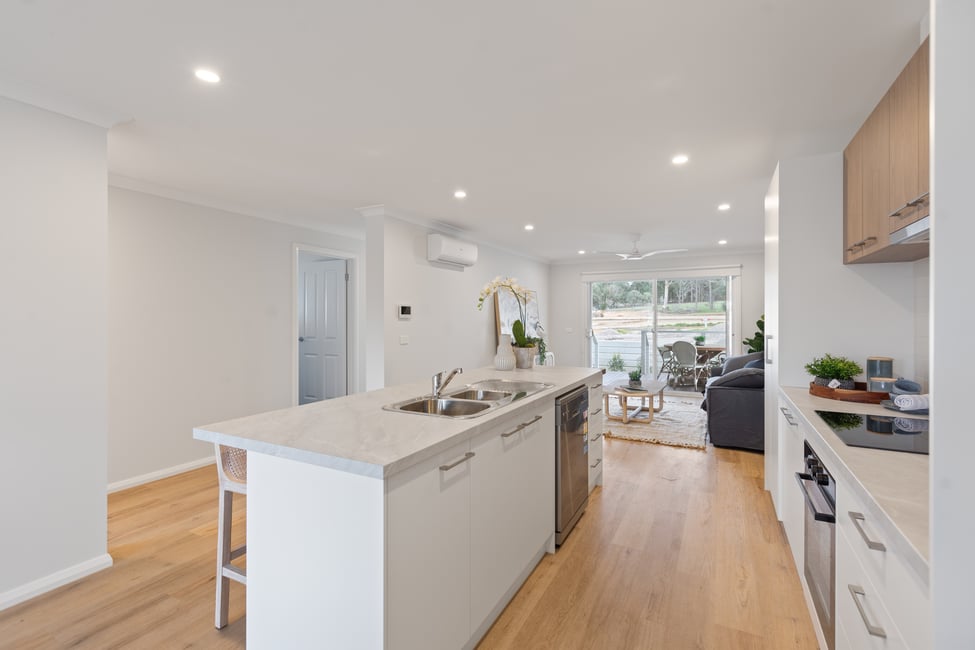 Step into The Hawkins and discover modern, open-plan living designed for comfort and connection. The light-filled kitchen, complete with a stylish island bench, flows effortlessly into the dining and family lounge areas, creating a welcoming space for relaxing or entertaining. Glass doors open to a private deck, perfect for quiet mornings, afternoon coffees, or easy outdoor gatherings.