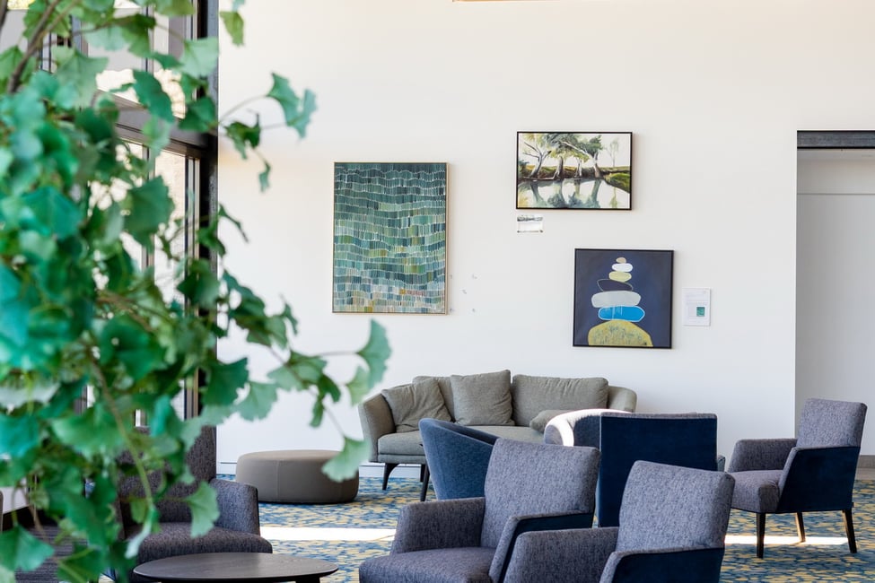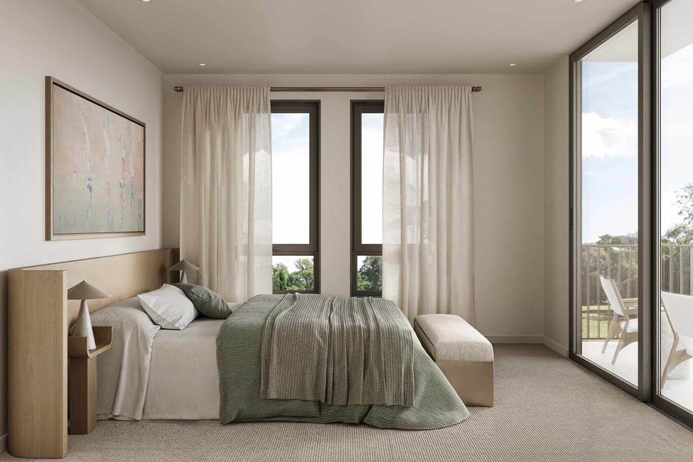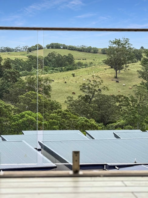 Floor-to-ceiling sliding glass doors from both the bedroom and living area fill the home with natural light and fresh airflow, seamlessly connecting the interior to a full-length covered balcony. Step outside and unwind as you take in the magnificent sunsets and sweeping views across the rolling hillside, a signature feature of the sought-after Mount Gilead Estate.