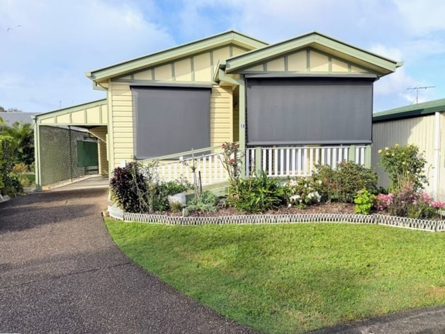 Green Wattle Community. Enjoy spacious open‑plan living that opens onto private covered backyard. Roofed front veranda with rolling screens/ & extra room add extra space & lovely appeal. This home features 2 generous double bedrooms, modern kitchen with dishwasher, 2 air-cons (living & main bedroom), separate toilet, easy walk‑in shower, & two great sheds — one powered. A new Bosch hot water system & fresh floor coverings complete the picture. All this in a vibrant over-50s village known for its friendly spirit and social lifestyle. Two Great Roofed Verandas Open Plan Living 2 Air-Cons & Dishwasher Upgraded Kitchen Great Extra Room