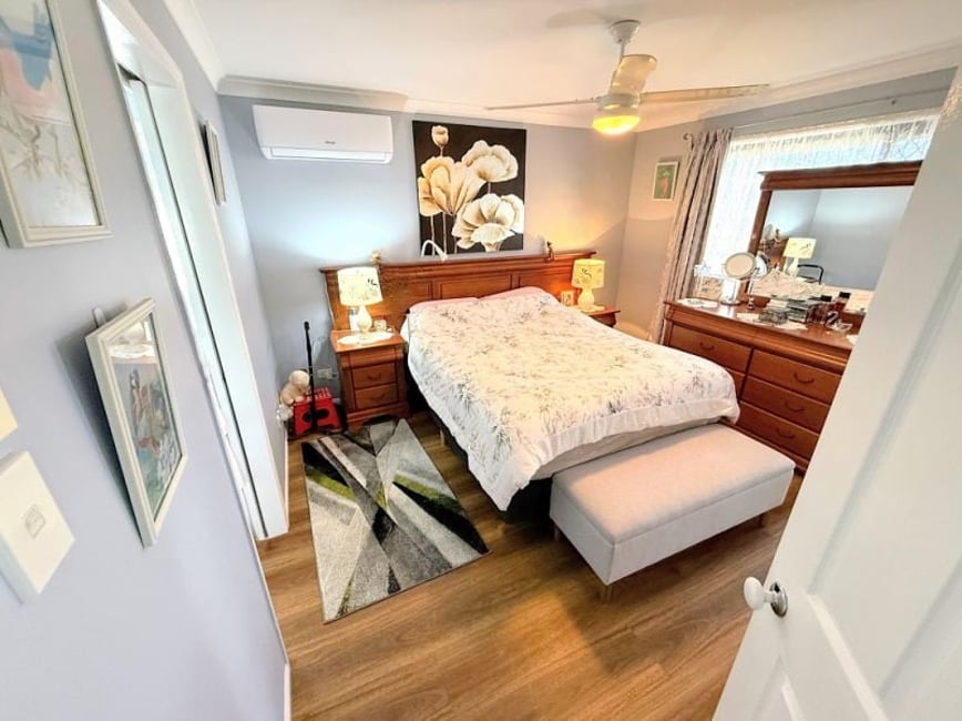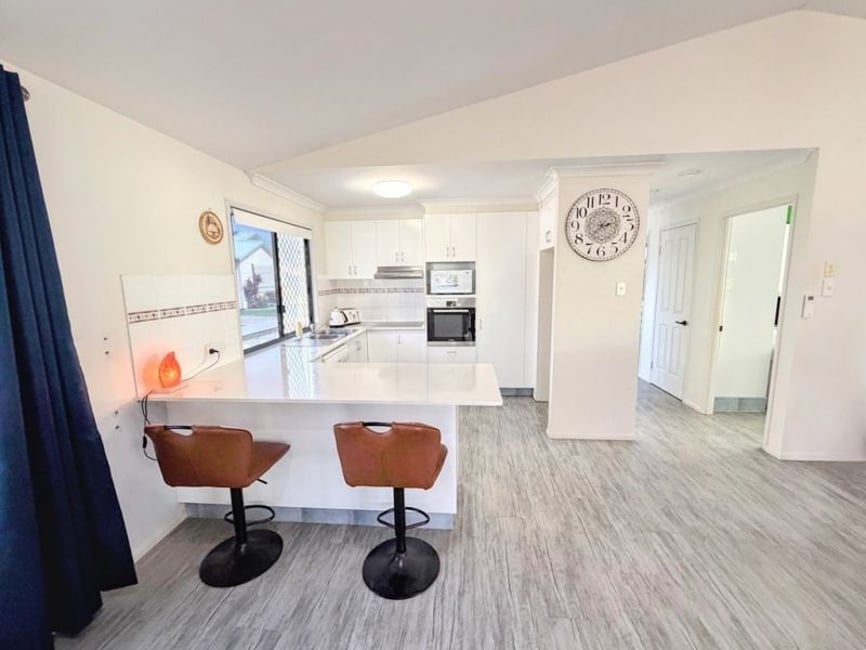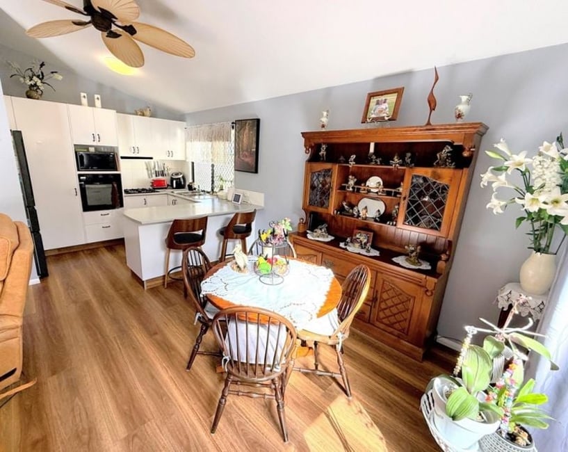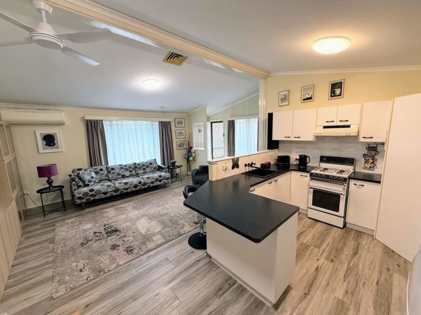 Green Wattle Community. Fabulous upgraded home featuring generous open-plan living/dining area & 3 spacious double bedrooms. A/C to 2 of the bedrooms and living, high quality timber floating floor throughout. Modern refurbished bathroom and kitchen. Fans throughout. Easy-care fenced private backyard. Great front garden. Enclosed carport, storage room & front veranda add convenience. Set in a vibrant over-50s village known for its strong community spirit and great activities. This gem won't last long—call today to inspect! Solar Power & Solar HW 3 Double Bedrooms Great Size Open Plan Living Remote roller door on Carport Storage Room & Water tank