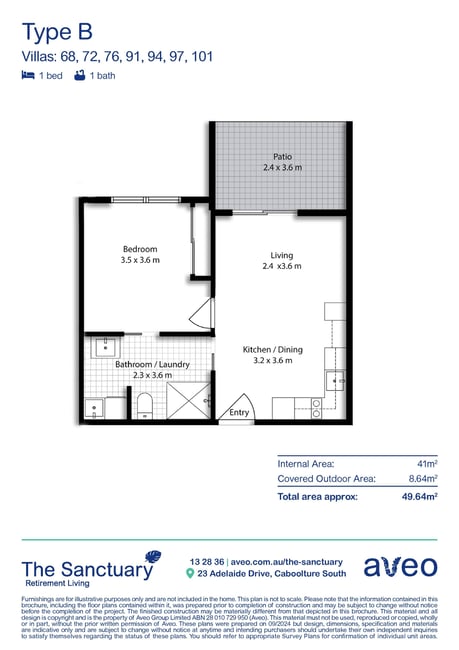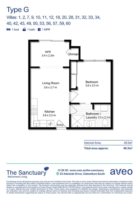 Your place to live well. This modern and easy-to-maintain one-bedroom villa is the perfect place to enjoy your retirement. The property features a modern kitchen with dishwasher, open-plan living and dining, a large bedroom with ample storage space, and a combined bathroom and laundry. Other features include a multi-purpose room, air-conditioning, and ceiling fans. This villa is centrally located to the main reception and communal facilities. Some villas can include basic furniture* for a hassle-free move. Property Features: - Modern kitchen - Open-plan living and dining - Multi-purpose room - Air conditioning and ceiling fans - Rear patio area - Combined bathroom/Laundry - 24/7 emergency call system Community features: - Outdoor pool - BBQ area - Community centre - Workshop area - Community bus - Media room - Gym - Billiard room - Library About The Sanctuary Retirement Living: Located minutes from the Morayfield shopping centre, The Sanctuary offers independent living with easy access to Brisbane CBD, Sunshine Coast and Moreton Bay while still retaining the charm and tranquility of the community of Caboolture. Shops and medical facilities are all right on your doorstep, as is public transport. Make time to view all the wonderful facilities this community has to offer. About Aveo Retirement Villages: For over 30 years, Aveo has been dedicated to delivering the best retirement living options for Australians. Whether you're looking for a low-maintenance lifestyle in a vibrant and social community or perhaps a community offering a little more support, we're here to help you find the right fit. Payment options available: This property comes with three payment options. Take your choice of the Now, Later or Bond payment options. Disclaimer: Furnishings are for illustrative purposes only and may not be included in the villa. *Basic furniture may be included. This offer is for a limited time only. Furniture options vary and are subject to availability. (village-id-81)