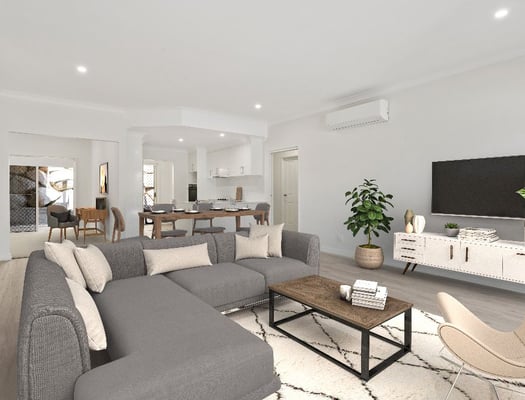 Open plan living area with a modern kitchen featuring clean lines and contemporary appliances