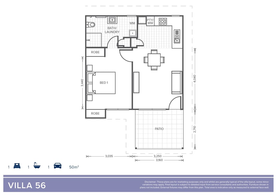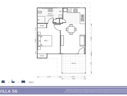 Located close to the Village Centre, Villa 56 includes lower bench tops in the kitchen, grab rails in the bathroom, shower and toilet that cater for greater accessibility. This villa is a low-maintenance home with a well-planned layout featuring one bedroom, and a generous bathroom, open-plan kitchen and living area connect easily to a patio for relaxed outdoor living. A centralised carparking space is included.