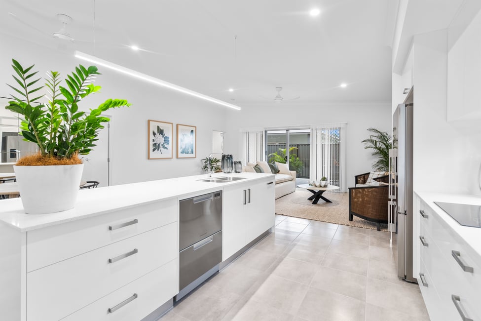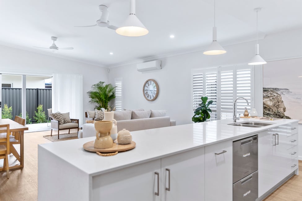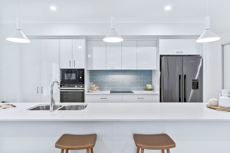 20mm stone benchtop on custom-made laminate kitchen with soft close doors and drawers