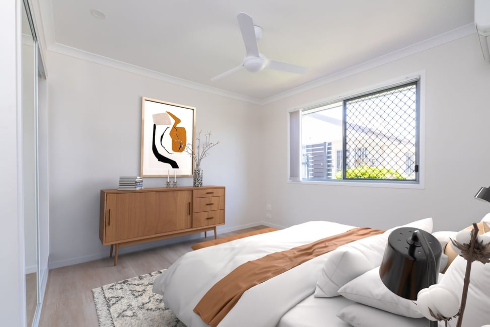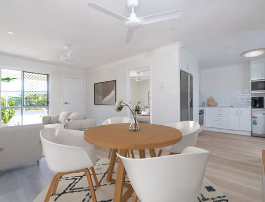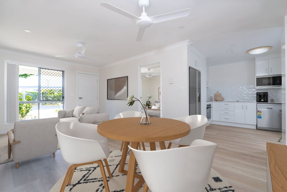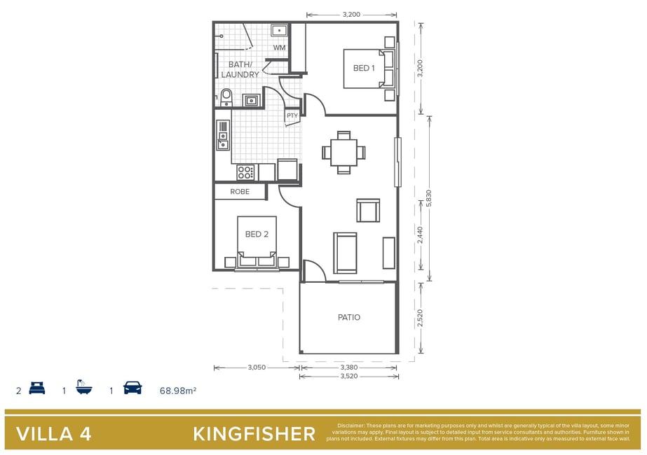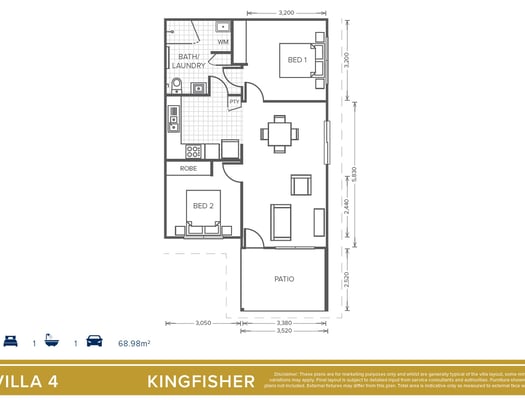 The Kingfisher design is an open plan, 2 bedroom, 1 bathroom villa with a full size kitchen and private outdoor area.