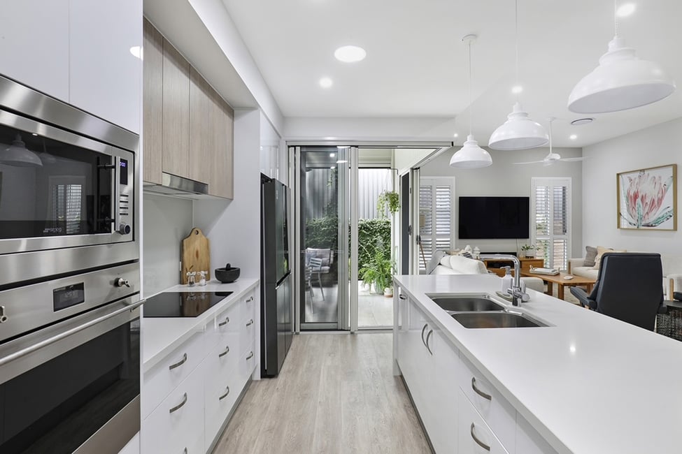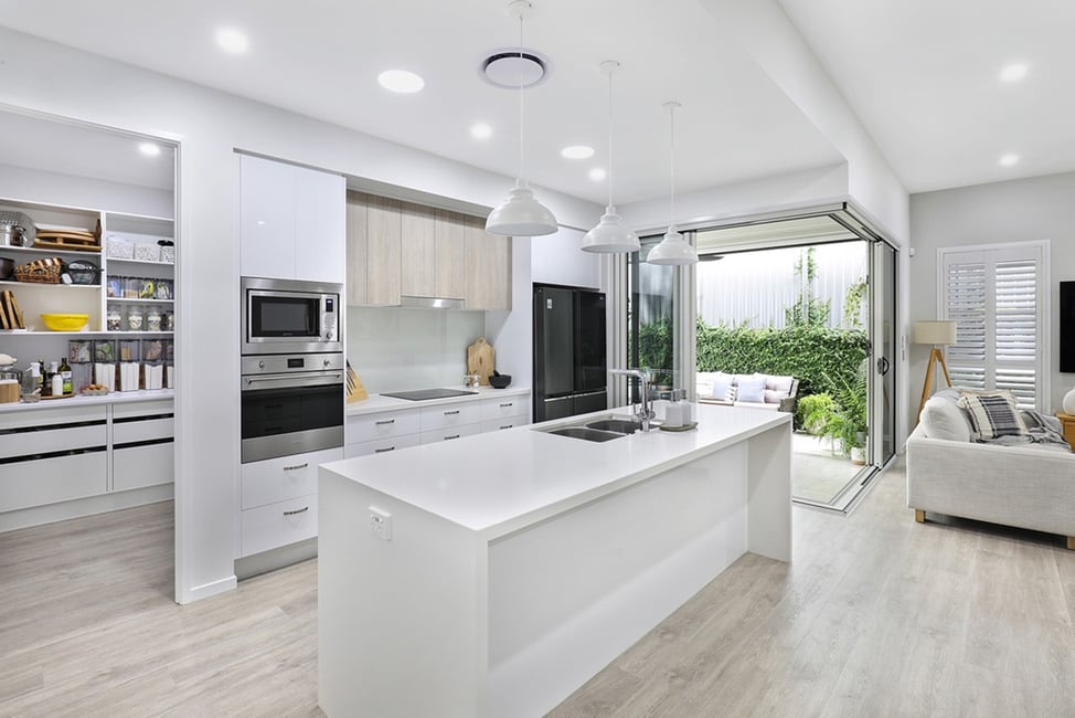 The master bedroom at the front of the home boasts a spacious walk-in wardrobe fit for the most extravagant of fashionistas and a double-vanity ensuite bathroom gives everyday living a luxurious feel. A modern, designer kitchen, equipped with high-end appliances, soft close drawers, integrated dishwasher, multi tap, microwave, and a walk-in pantry with adjustable shelving, makes cooking a joy.