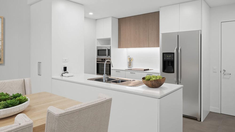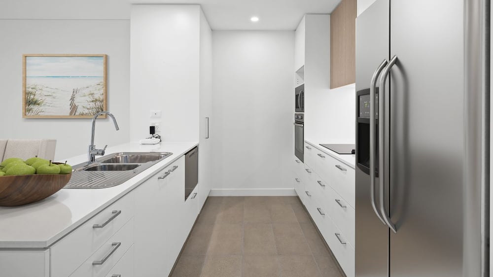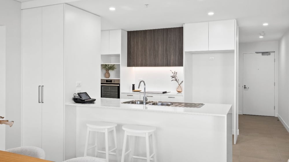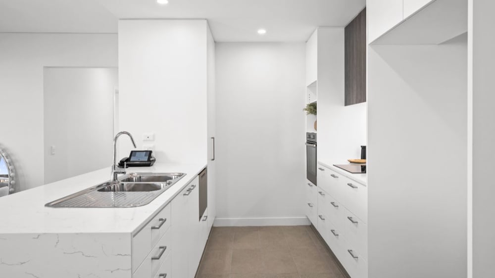 - Modern kitchen with stone benchtops and dishdrawer