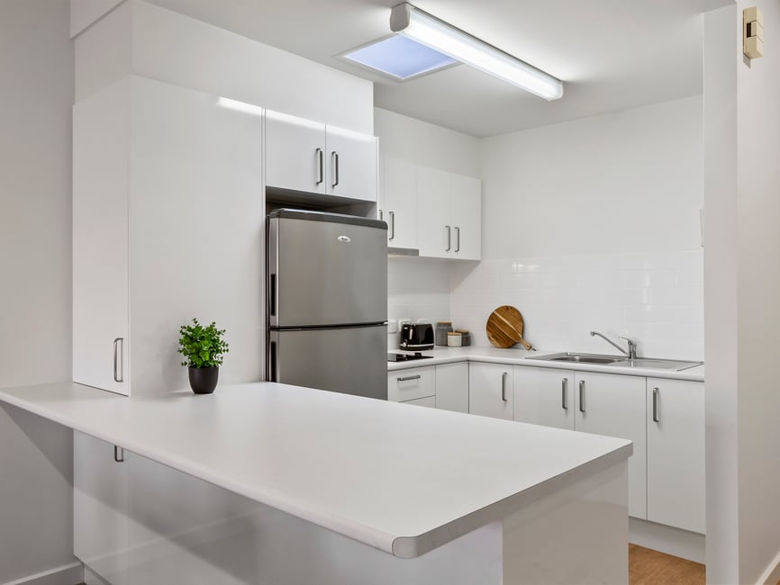 Modern kitchen with reconstituted stone benchtops and stainless-steel appliances