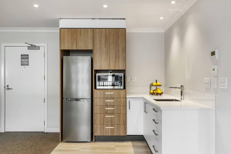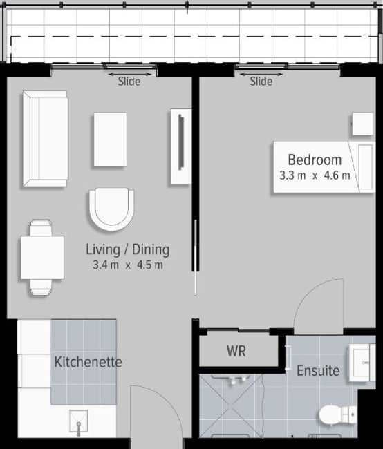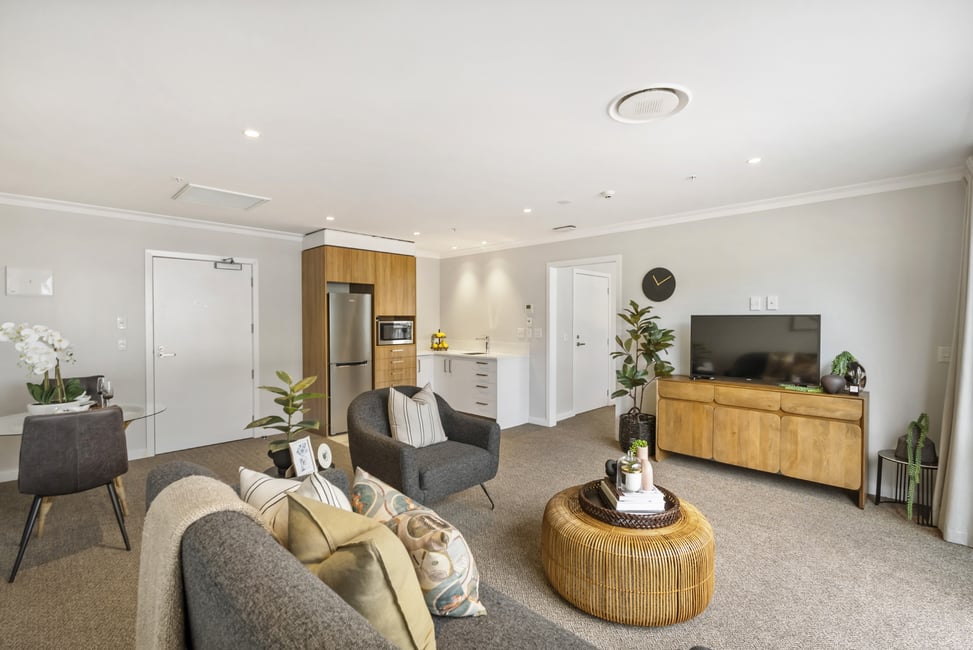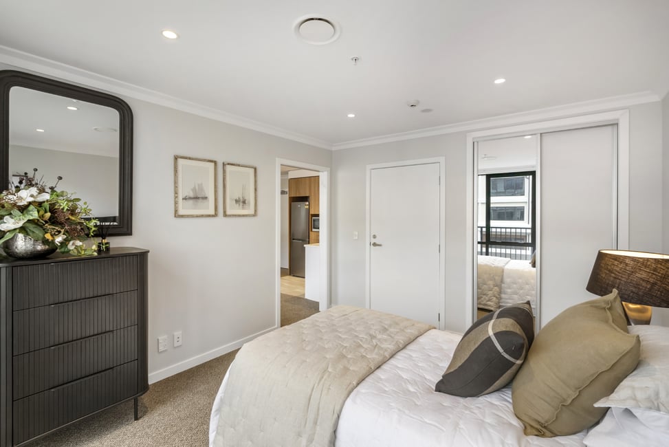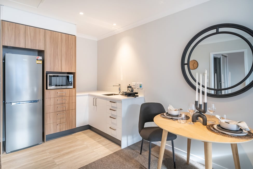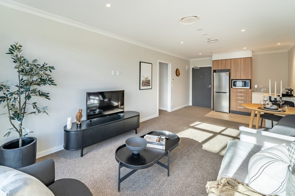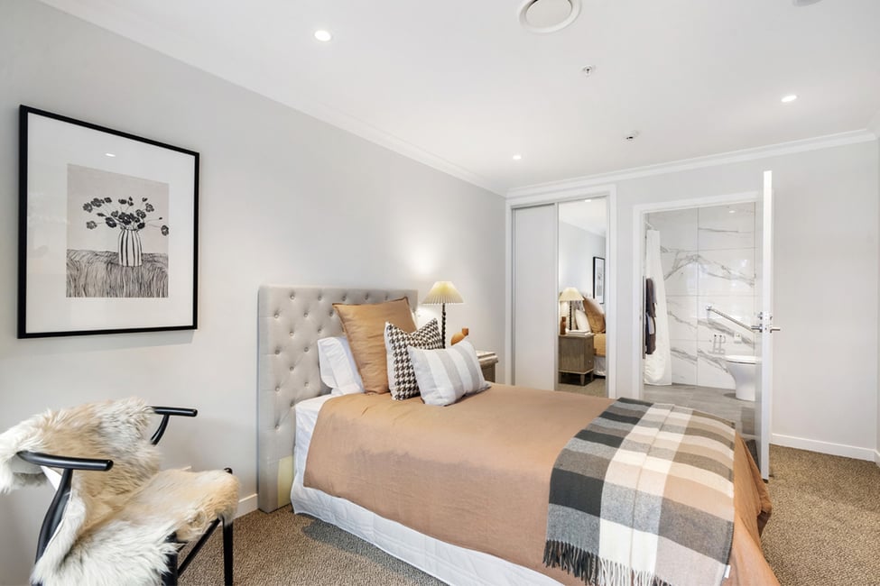 This apartment has a generous open plan living and dining area featuring a modern kitchenette. A sunny balcony is the perfect spot for a table and chairs, potted plants and watching village life below. Your separate bedroom has ample room for belongings plus boasts balcony access and a luxurious ensuite.