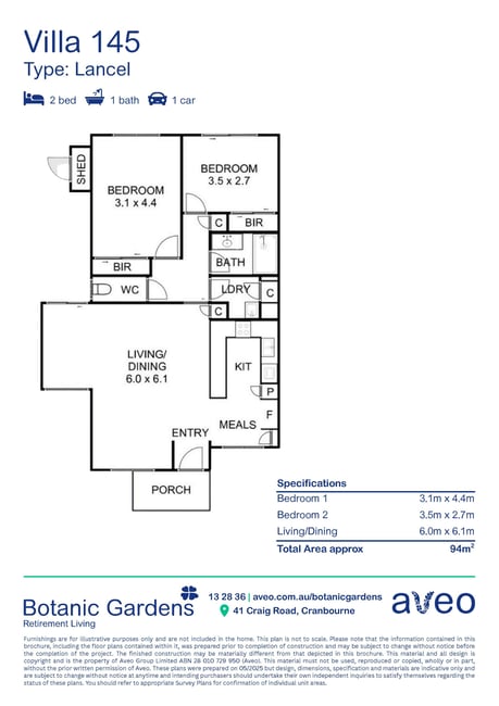 Retirement living at its best! Free-standing 2-bedroom plus study villa nestled in a quiet and lovely court is ideal for enjoying a relaxed retirement lifestyle. The living and kitchen areas feature stylish wooden flooring, while the master bedroom includes a walk-in robe. The study area is seamlessly integrated with the kitchen, making it easily accessible for everyday use. The modern designed bathroom ensures ease of use and everyday comfort. The spacious open-plan layout flows effortlessly into a private backyard with a charming outdoor pergola perfect for entertaining guests or enjoying a BBQ with friends and family. Property Features: - Specious floorplan 2 bed + study - Wooden flooring in living/kitchen and study area - Walk in robe in master bedroom - Split system - Ceiling fan - Outdoor pergola - Private backyard - Single carport Community features: - Bowling green - Workshop - Arts and crafts area - Library - Dining room - Outdoor recreational area - Community centre - Community bus About Botanic Gardens Retirement Living: Escape the city rush and immerse yourself in the relaxing, tranquil atmosphere that is signature to Botanic Gardens. This village is redefining retirement living with a stunning range of affordable housing solutions, combined with an impressive range of on-site amenities. Every day brings something new in our pet-friendly village, including our regular happy hours and Friday night dinners. Enquire today to find out more about living at Botanic Gardens. Our friendly sales team will be happy to meet with you, take you on a tour of the community and answer any questions you may have. About Aveo Retirement Villages: For over 40 years, Aveo has been dedicated to delivering the best retirement living options for Australians. Whether you're looking for a low-maintenance lifestyle in a vibrant and social community or perhaps a community offering a little more support, we're here to help you find the right fit. Payment Options Available: This property comes with three payment options. Take your choice of the Now, Later or Bond payment options. Buyer must enter into separate contract with retirement village. Disclaimer: Images have been staged using virtual furniture, to show what it may look like when furnished. (village-id-69)