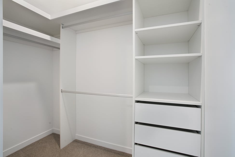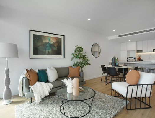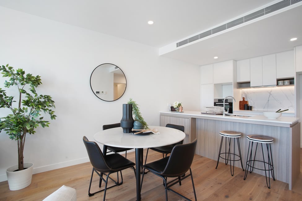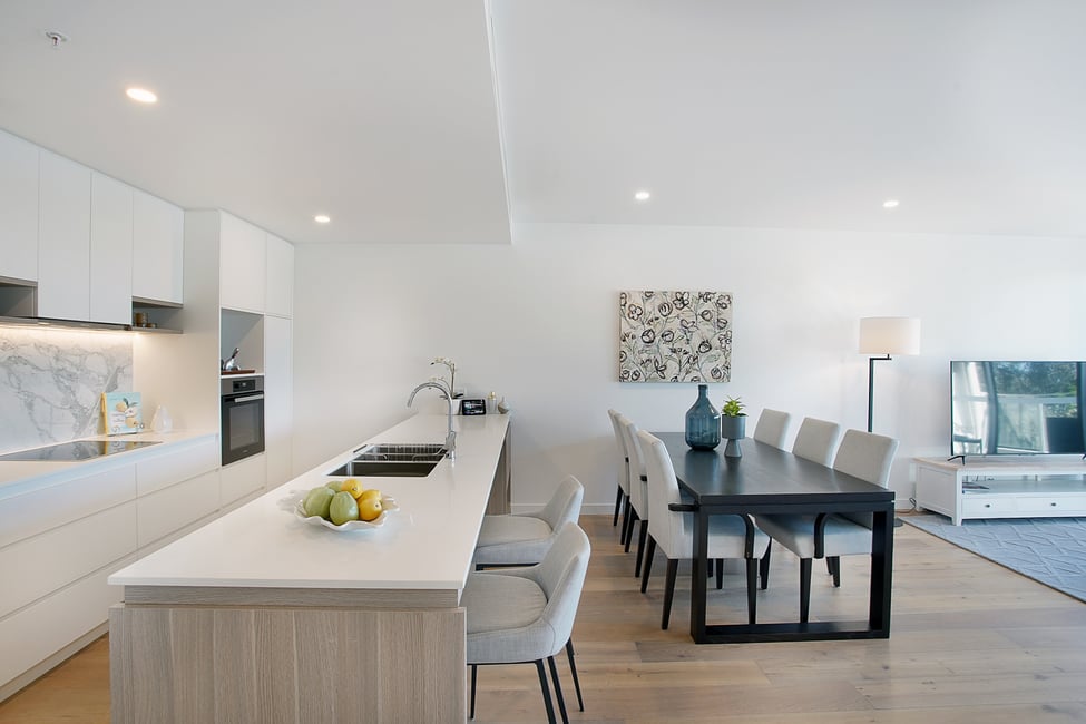 The open plan living area opens out onto the balcony through sliding glass doors. As with all our apartments at The Healey, the kitchen features the luxury inclusions of beautiful stone benchtops, Blum pantry system with soft close drawers and cabinets, marble splashback and quality Miele appliances.