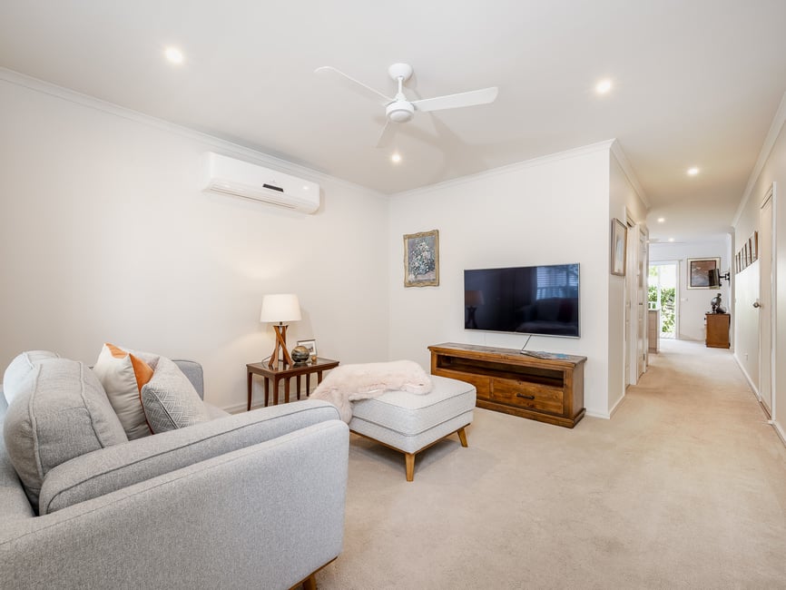 Centrally located and just a hop and a skip to the outdoor pool and Aqua Club, this cosy 2-bedroom home is a cheerful sanctuary. The East facing rear alfresco with established plants provides a tranquil retreat which flows off the light-filled kitchen and dining area, while the north-facing front deck is a great spot for a chat with neighbours. The home features: • Separate lounge room with block-out blinds, fan and split system heating/cooling plus gas heater to the dining room • Spacious bedrooms with quality drapes and ample wardrobes • Security doors and side entry from carport • Low maintenance backyard with artificial turf and pavers • Handrails to shower & toilet for added support • External shade blinds to front deck