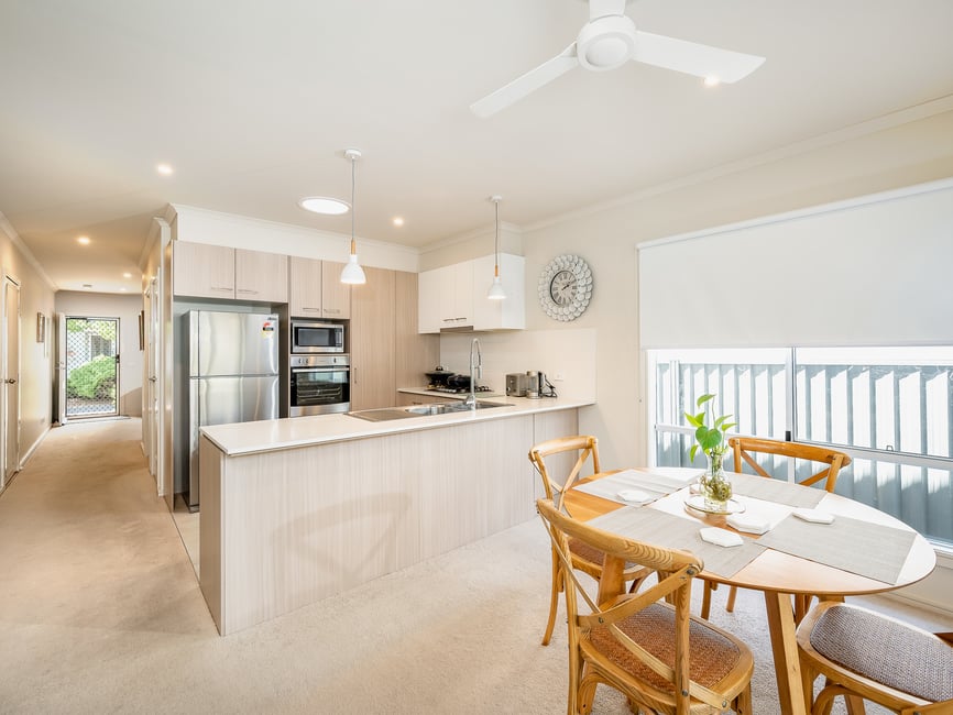 Just a short stroll to the Clubhouse, this charming two-bedroom home is designed for relaxed, low-maintenance living. Enjoy a private, spacious rear yard with artificial turf, pavers, and a raised veggie garden – perfect for entertaining or unwinding outdoors. The light-filled kitchen and dining area opens onto a shaded alfresco, ideal for summer evenings or a quiet morning coffee. Features include: * Low level East-facing alfresco area with shade blinds * Vinyl wood-plank flooring to the dining/kitchen area * Separate lounge area * Two way bathroom/ensuite * Large rear yard with garden beds * Large carport area