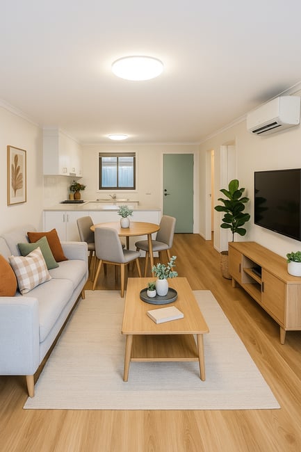 Enjoy a spacious open-plan layout with dedicated areas for both dining and living. The bathroom offers easy access and a walk-in shower, and the toilet is conveniently separate.